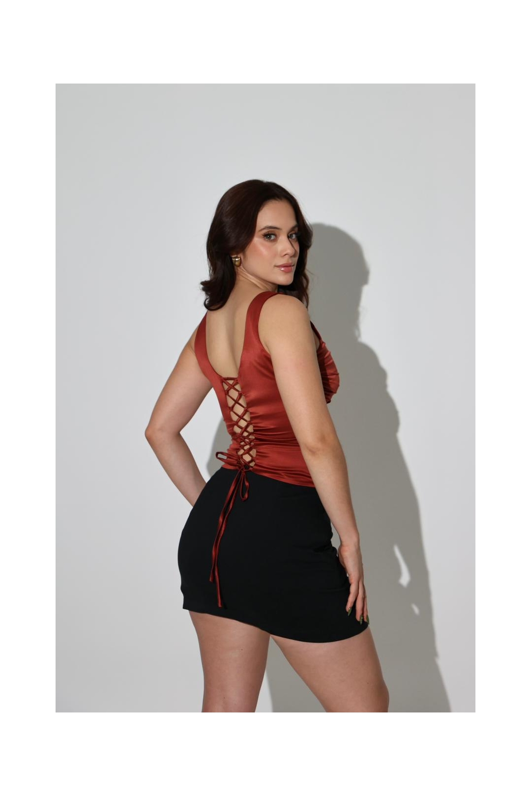 Top satinada en tejido plano, escote cuadrado con drapeado en el busto y ajustable en la espalda que amolda la silueta