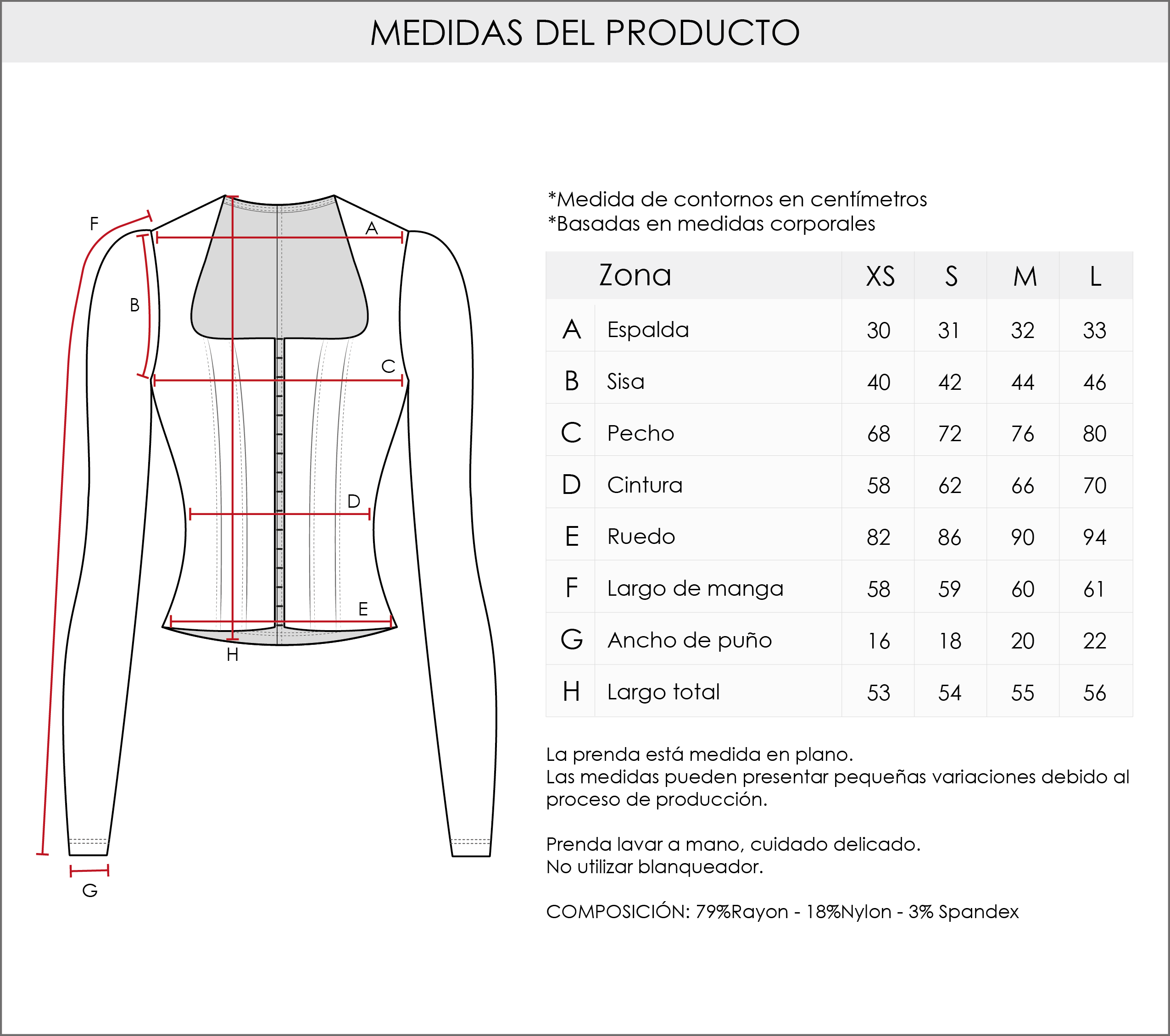 Top strech con escote cuadrado, manga larga, gafetes central que resalta la silueta
