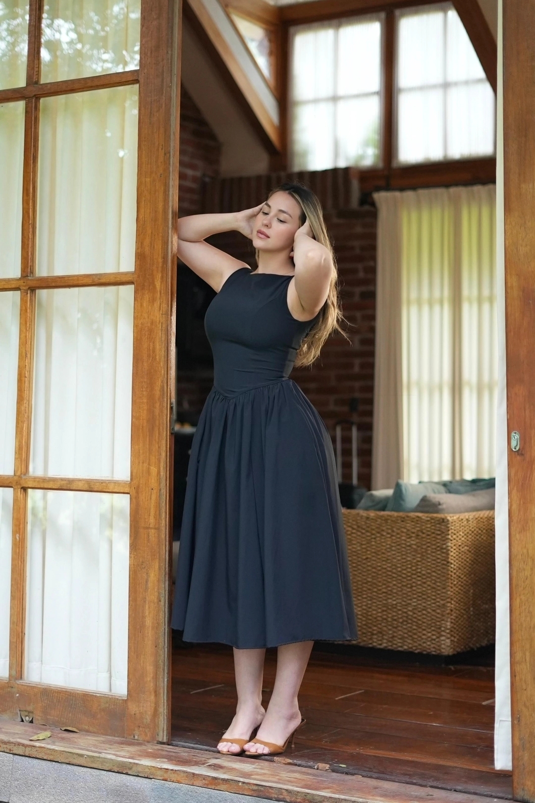 Vestido midi en tejido plano stretch con escote redondo, manga sisa y corte en la cintura semi en V. Diseño ajustado en la parte superior, falda amplia con bolsillo y caída fluida.