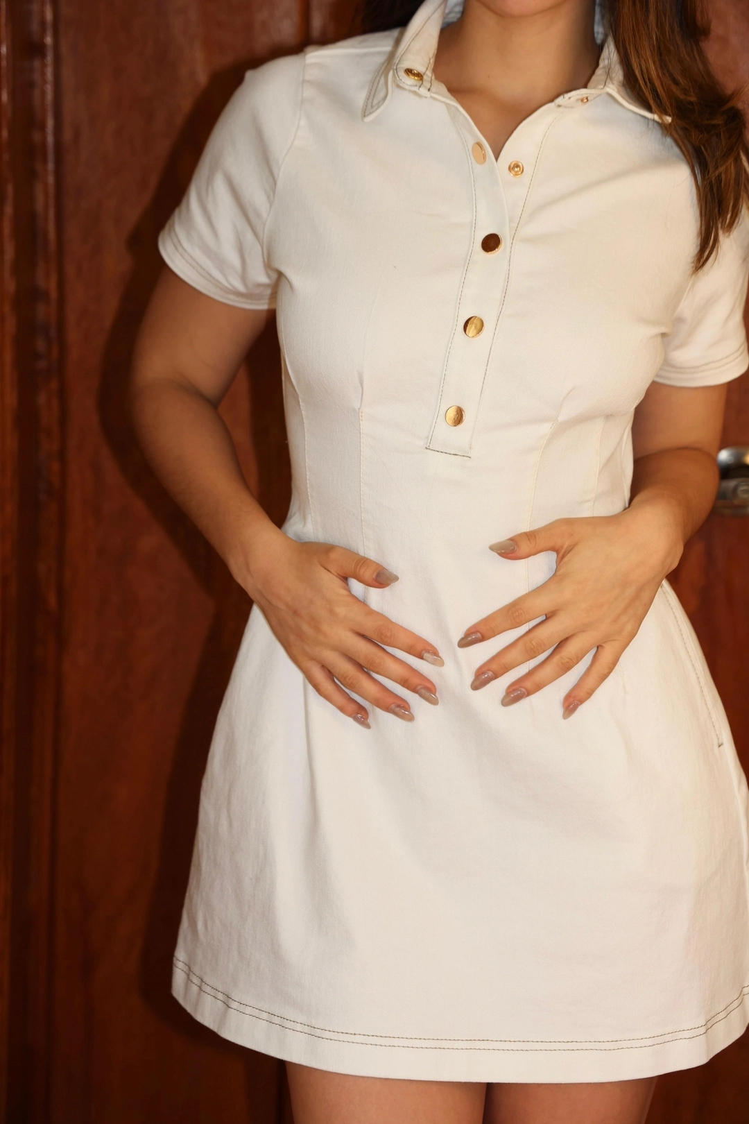 Vestido mini denim con cuello sport, cartera con broches funcional y bolsillos laterales. Diseño entallado de manga corta con silueta ajustada que define la figura.