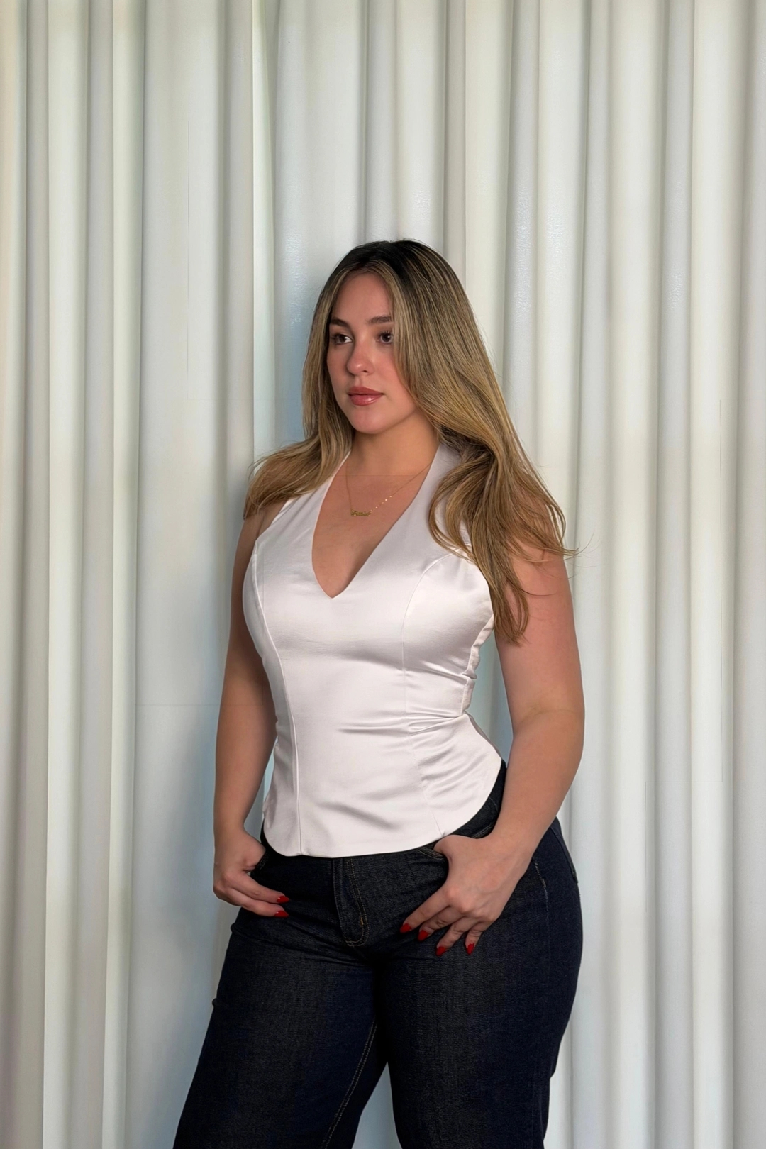 Blusa en tejido plano con cuello halter, broche y escote en V. Diseño con tiras ajustables en la parte posterior que amolda la silueta. No estira.