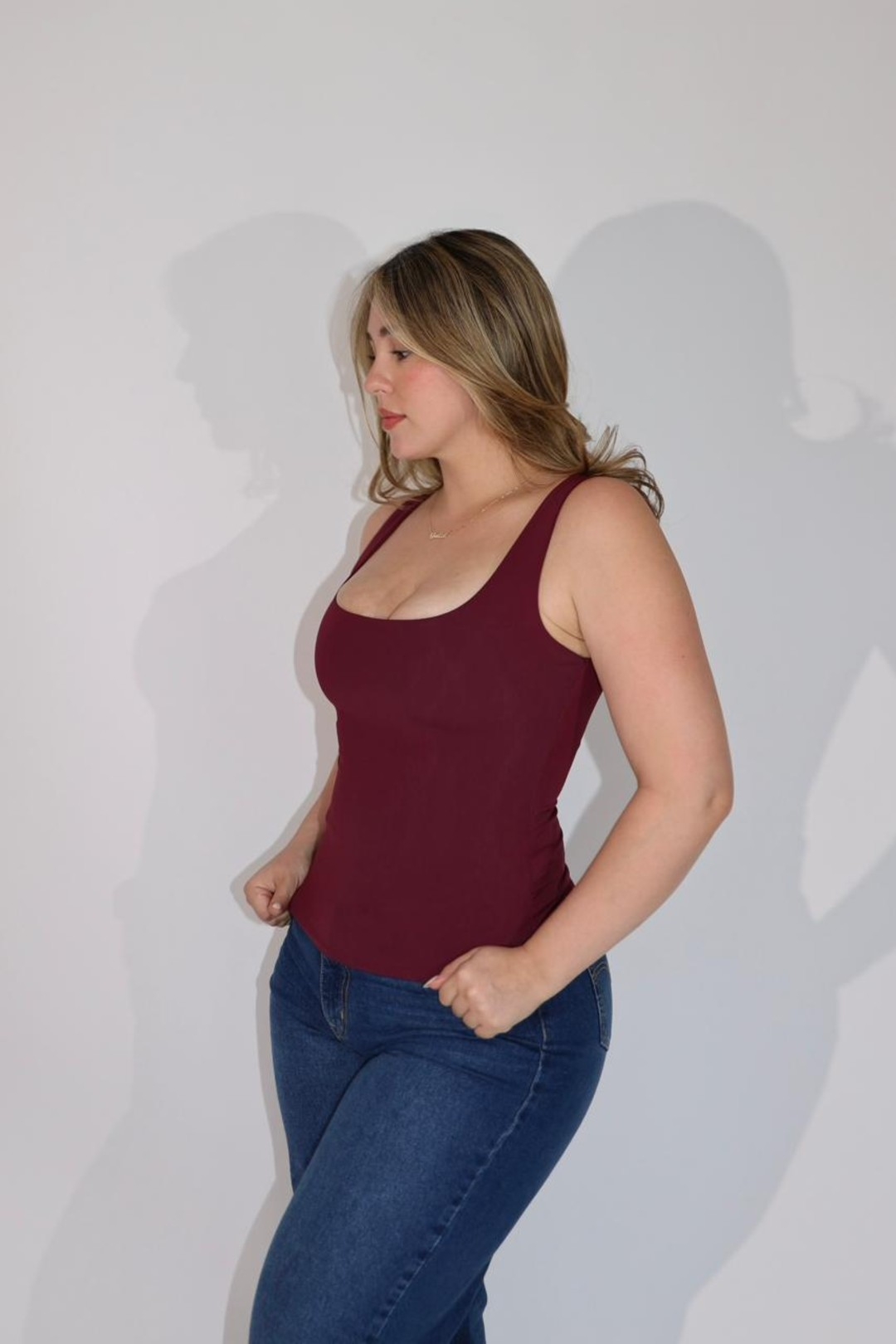 BLUSA EN TEJIDO STRETCH CON ESCOTE CUADRADO Y SIN MANGAS. DISEÑO CEÑIDO CON EFECTO COMPRESIÓN. SI ESTIRA.